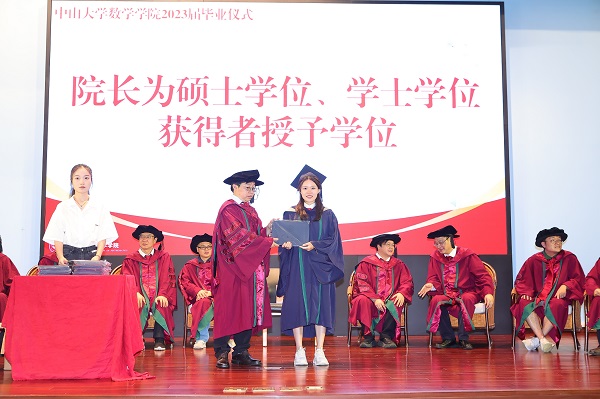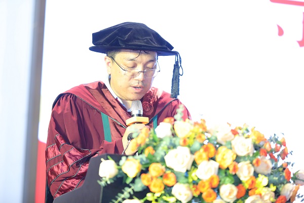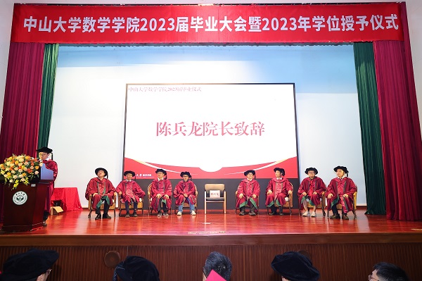 典礼伊始,陈兵龙经理致辞,他首先对所有即将开启人生新征途的毕业生们表示了热烈的祝贺,接着从数学的角度出发,勉励诸君当志存高远、坚守初心。在未来的道路上,不骄傲狂妄,也不妄自菲薄。经过数学的磨砺,收获比同龄人多一份的底气与自信,多一份的从容与淡定、顽强与坚定。而这些增益又将助力数院学子行稳致远,取得属于各自的美好前程。最后陈兵龙经理亲切地对从今天开始中大数院最年轻的员工说:“数院的怀抱永远为你们敞开!”致辞结束,台下响起热烈的掌声。