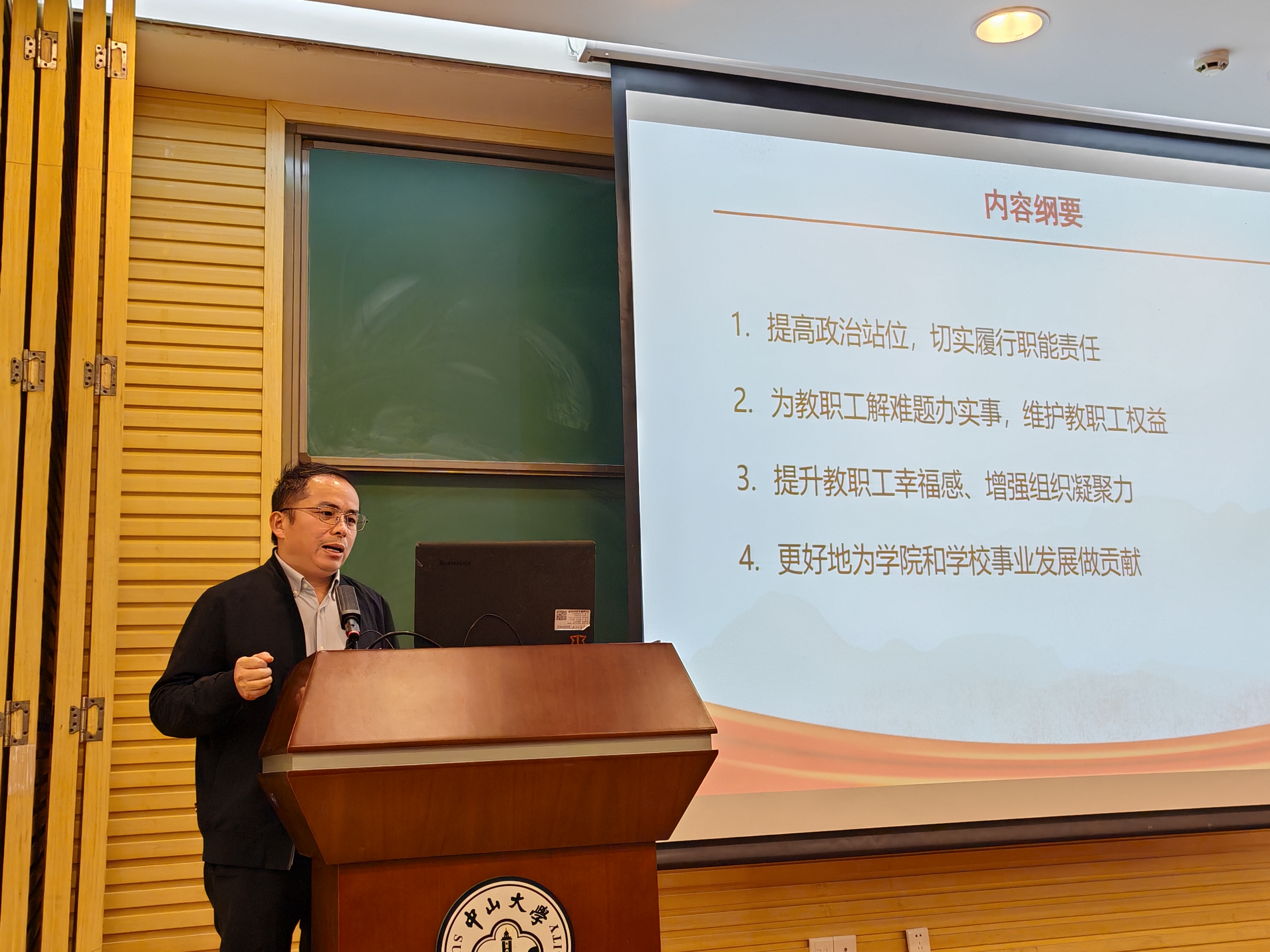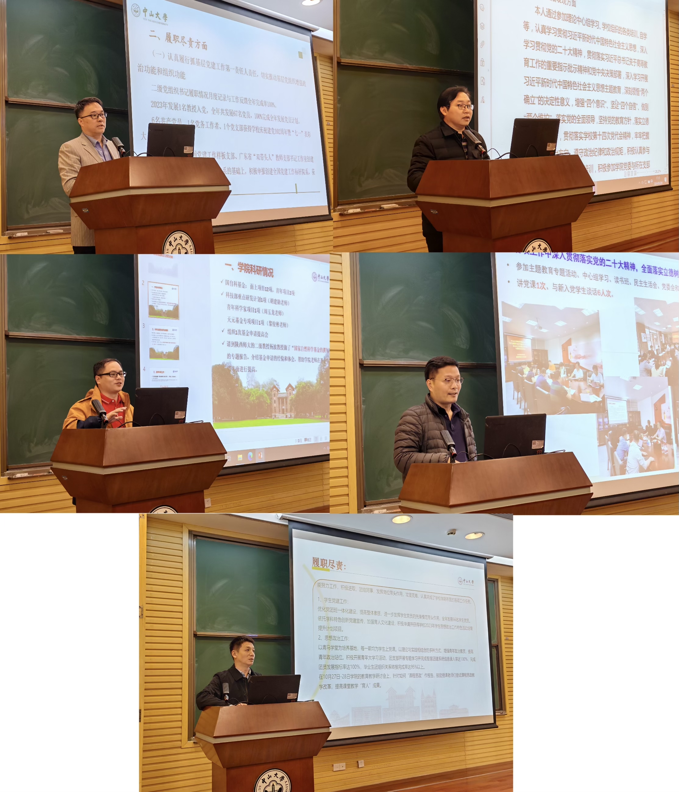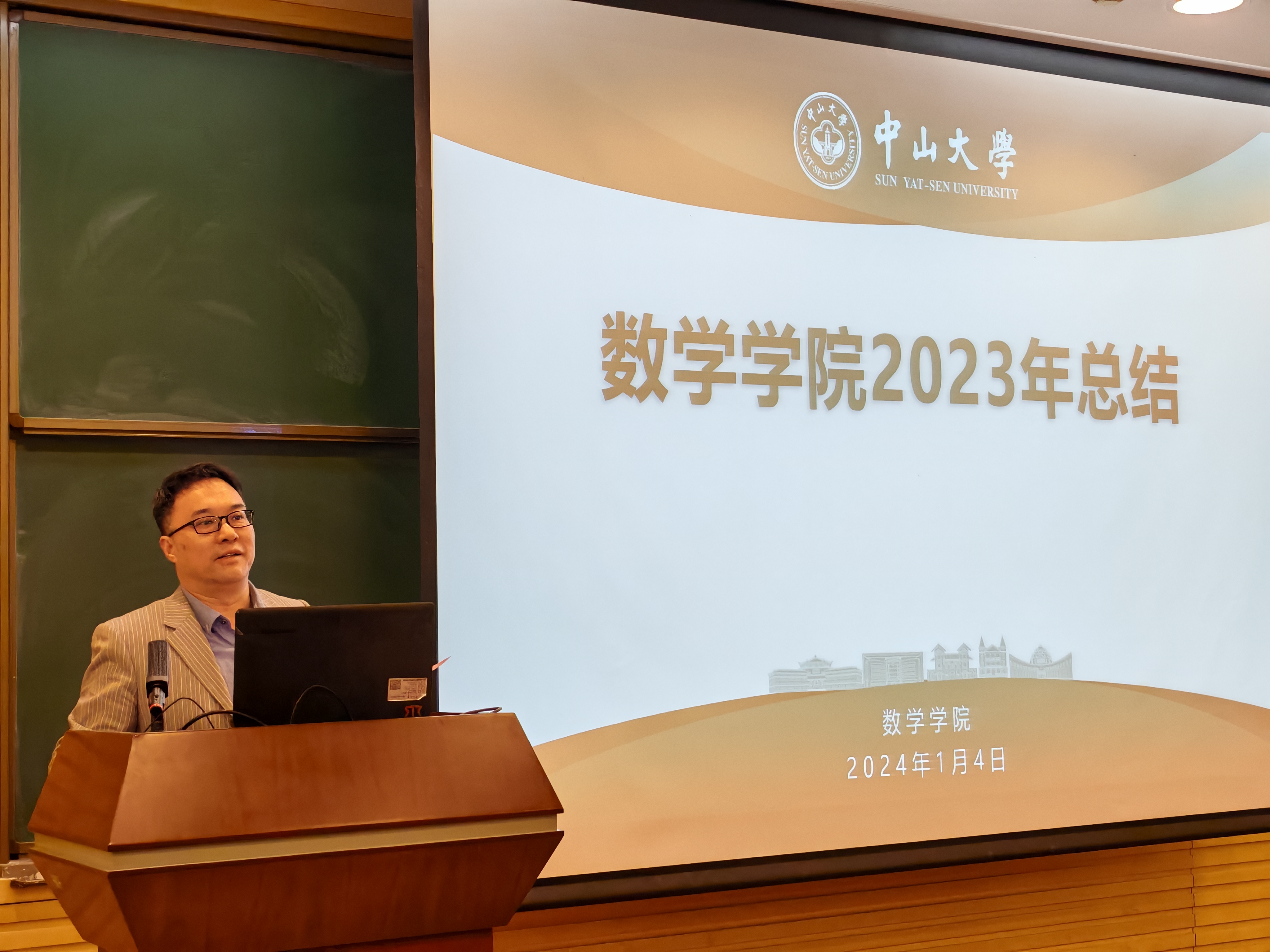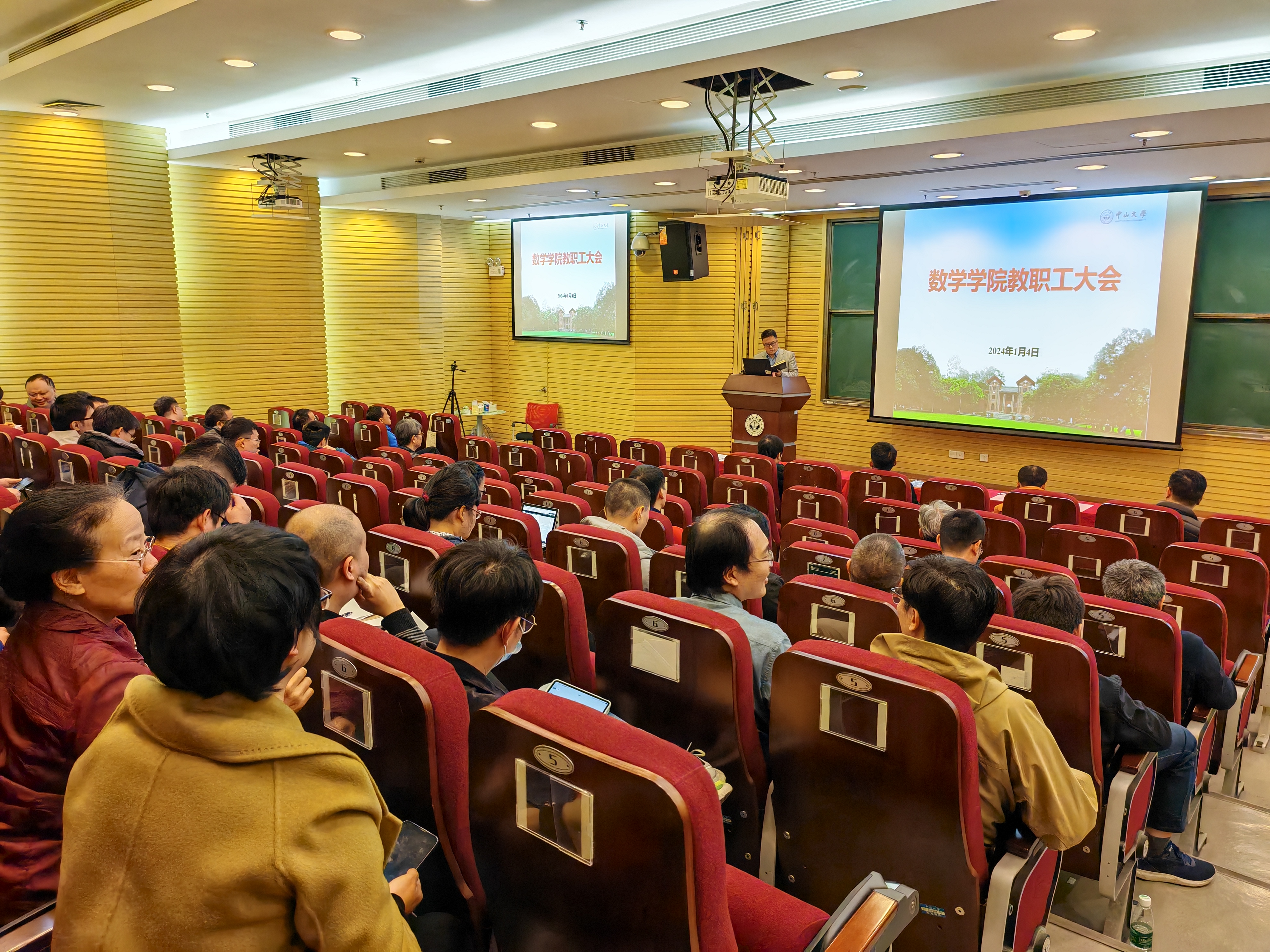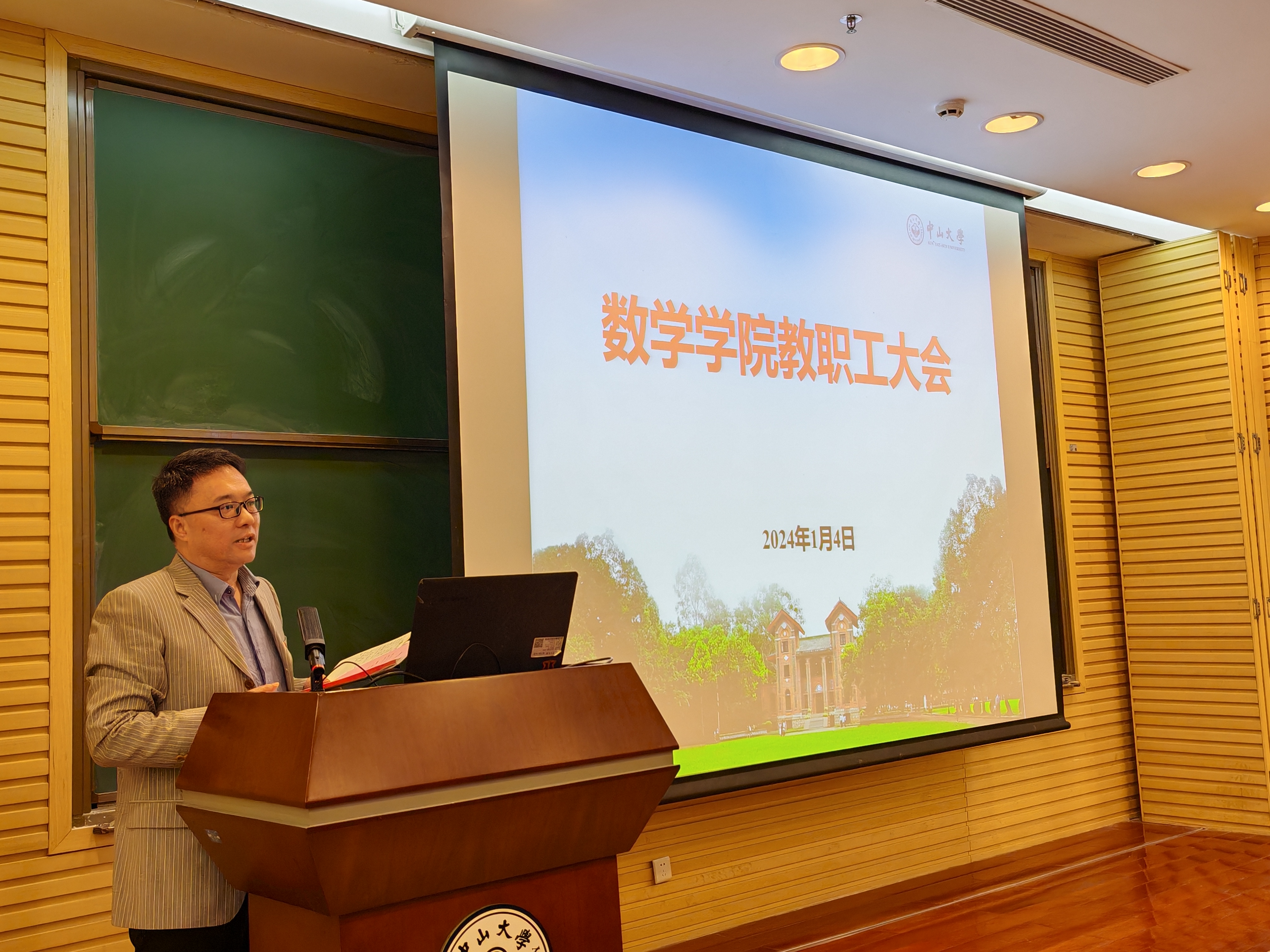 大会的第二阶段是公司2023年“总结和述职大会”。会议首先由阮映东书记代表公司总结报告过去一年在组织建设、学科评估、团队建设、党建工作、员工工作、科研项目等方向取得的优异成绩。阮书记指出,百年中大,百年数学;百头竿尺,再接再厉!号召全体教师职工在新的一年更进一步,用更出色的成绩为中大百年华诞及数学百年献礼。