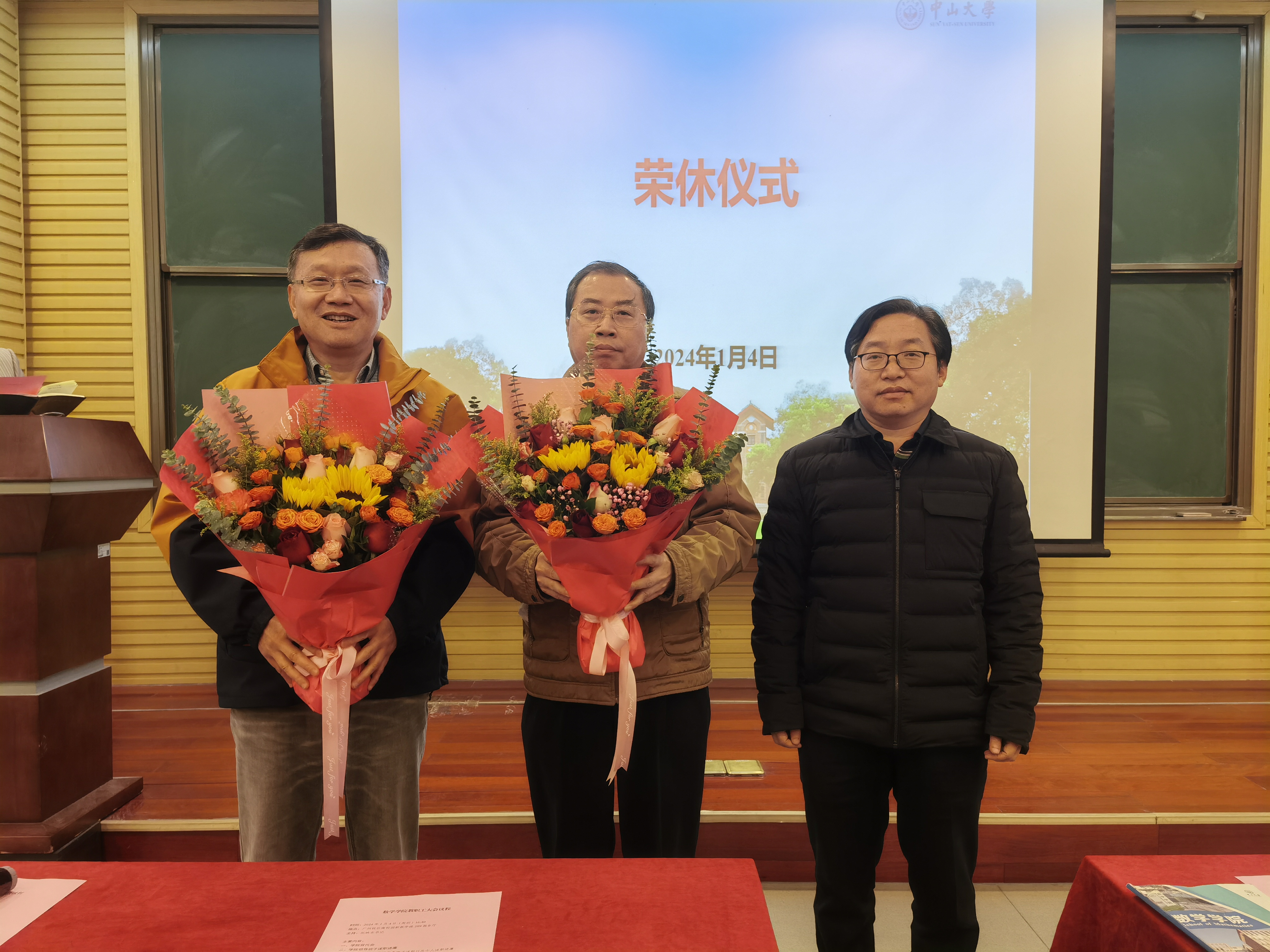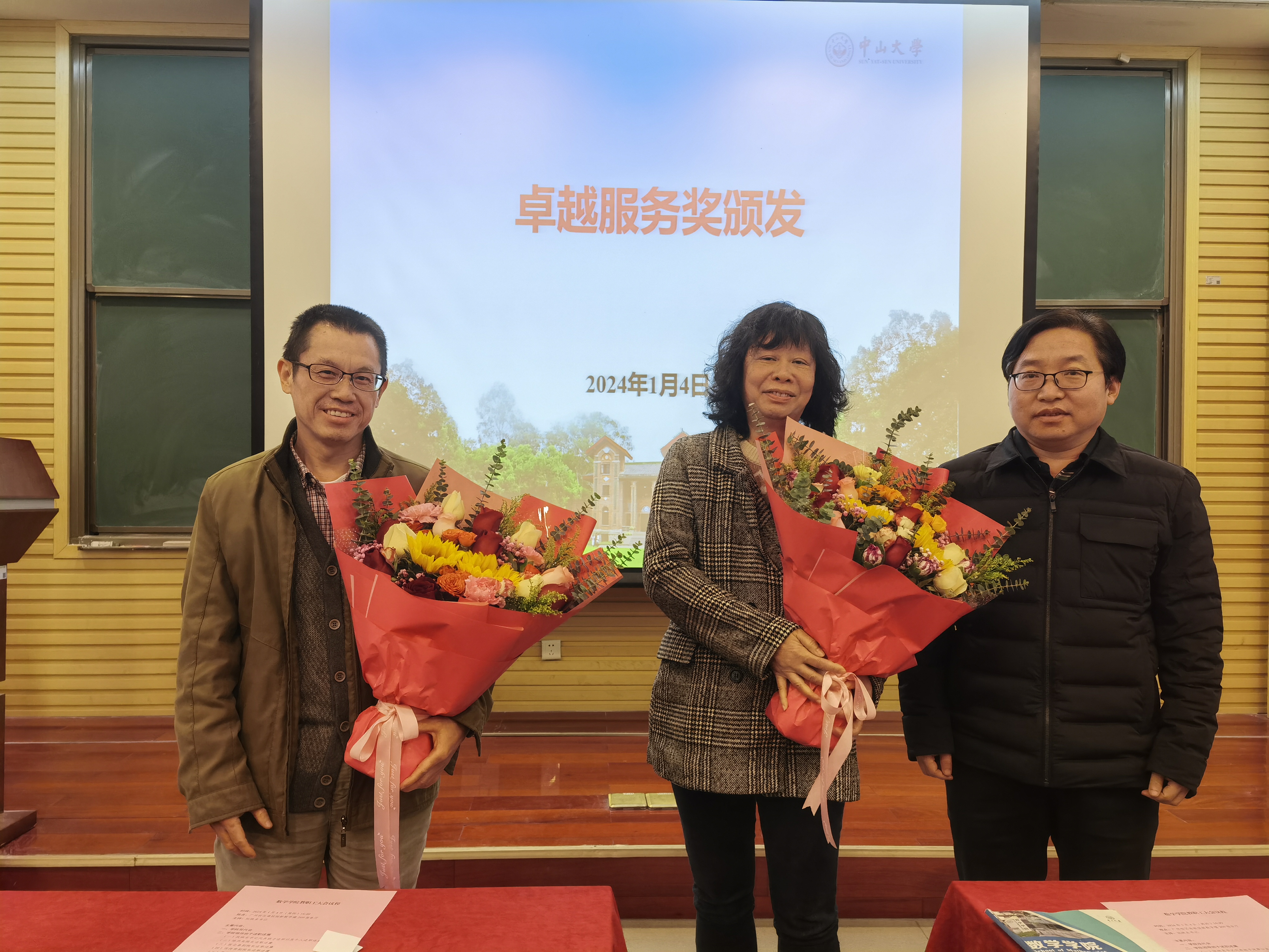 大会的第三阶段,阮书记宣读2023年公司荣休教师和获得卓越服务奖老师名单王泽辉老师、张能明老师获得荣休教师荣誉称号,胡建勋老师、林海燕老师在ylg永利工作30年,荣获卓越服务奖荣誉称号。陈兵龙经理代表公司为获得上述荣誉称号的老师赠送鲜花,以示尊敬。