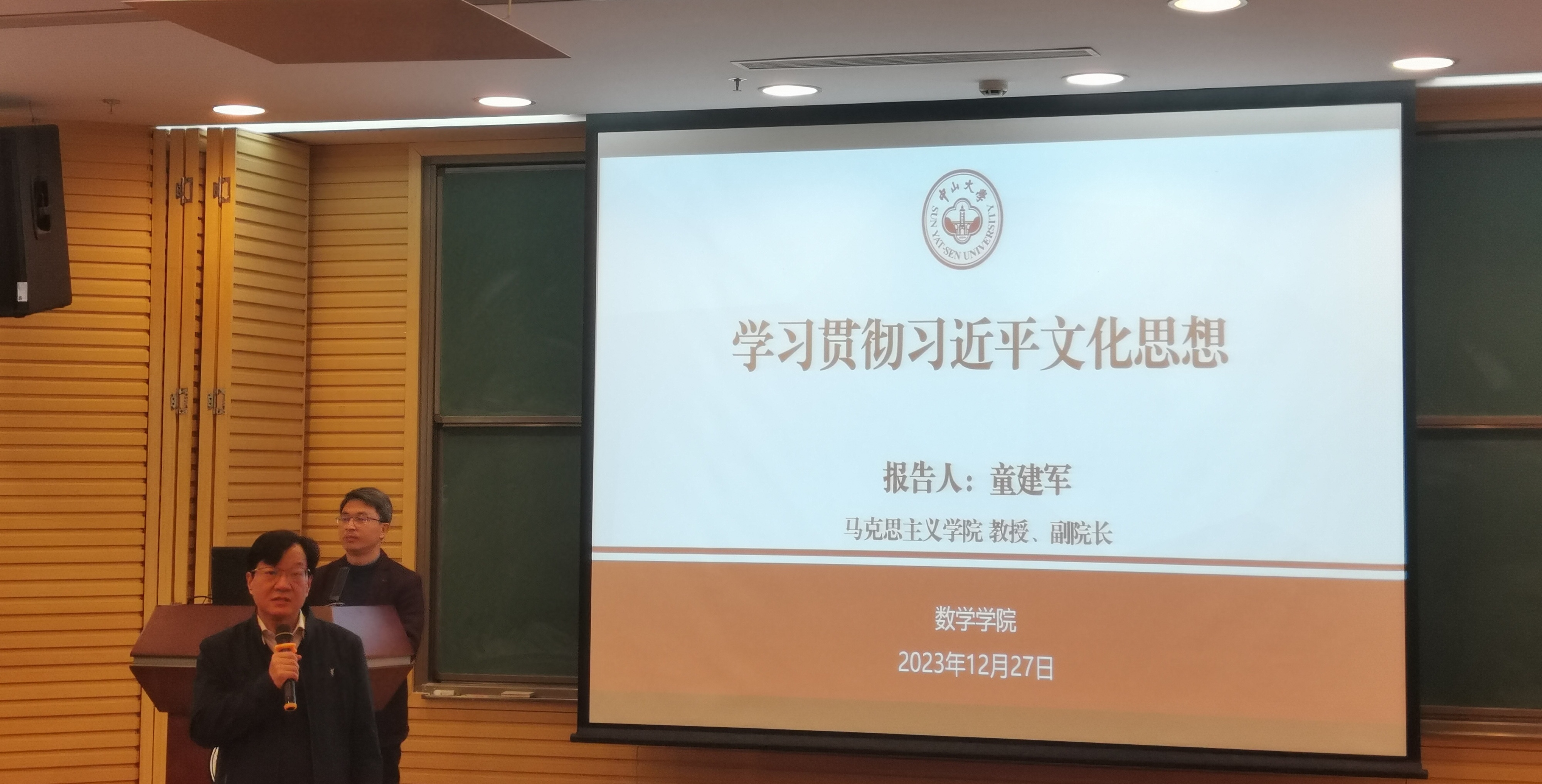 2023年12月27日中午,为学习贯彻习近平新时代中国特色社会主义思想,马克思主义公司副经理童建军教授应ylg060net永利娱高基础数学教师党支部和数学硕士研究生党支部联合邀请,在新数学楼209报告厅以《传承中华优秀传统文化——学习贯彻习近平文化思想》为题开展主题党课,讲授习近平文化思想的核心要义,带领大家了解中华优秀传统文化,深入理解习近平文化思想。